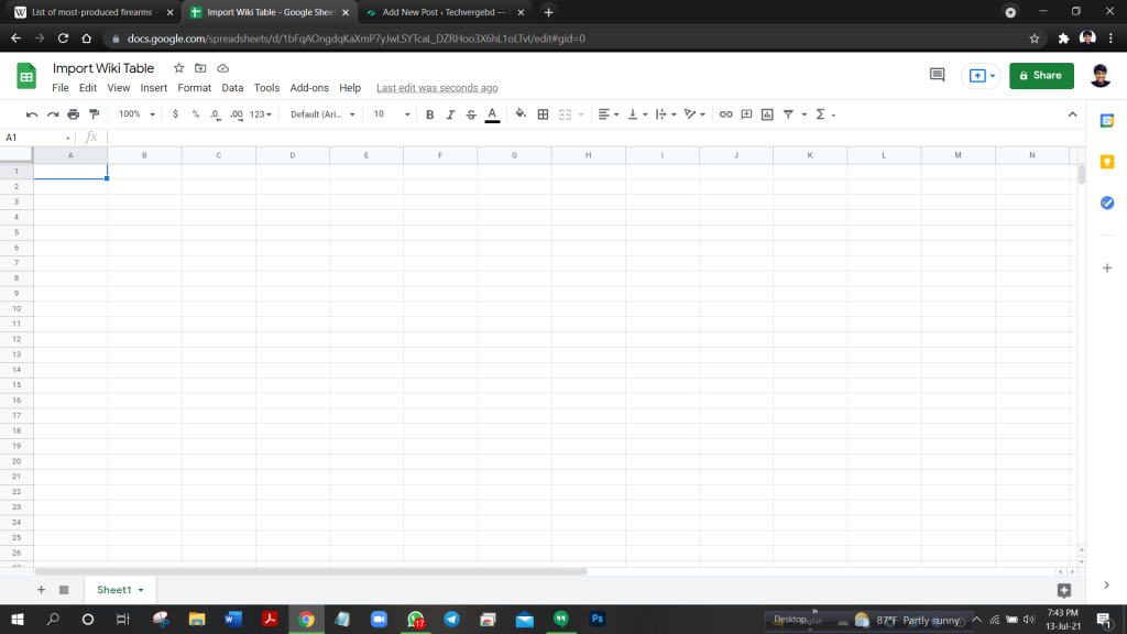প্রথমে গুগল শিট ওপেন করে একটি ব্ল্যাঙ্ক শিট তৈরি করুন। আপনি চাইলে আগে থেকে কাজ করা কোনো শিটেও টেবিল ইমপোর্ট করতে পারবেন। শেখার সুবিধার্থে নতুন একটি শিট ওপেন করুন। এর নাম দিতে পারেন Import Wiki Table। আপনি আপনার ইচ্ছে অনুযায়ী আপনার ডেটা ফাইলের নাম দিন।