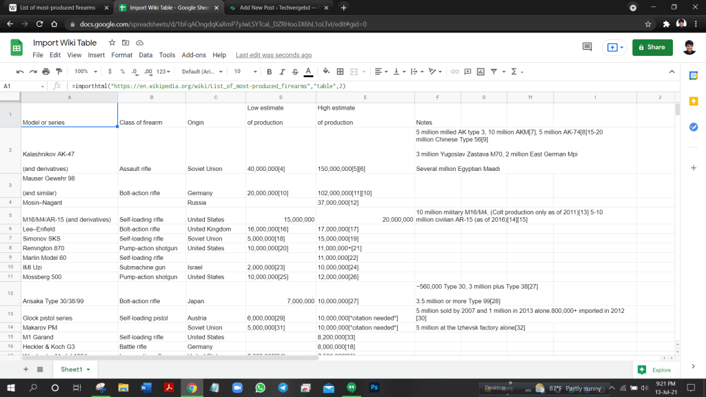 =IMPORTHTML(“https://en.wikipedia.org/wiki/List_of_most-produced_firearms”, “table”, 2,)